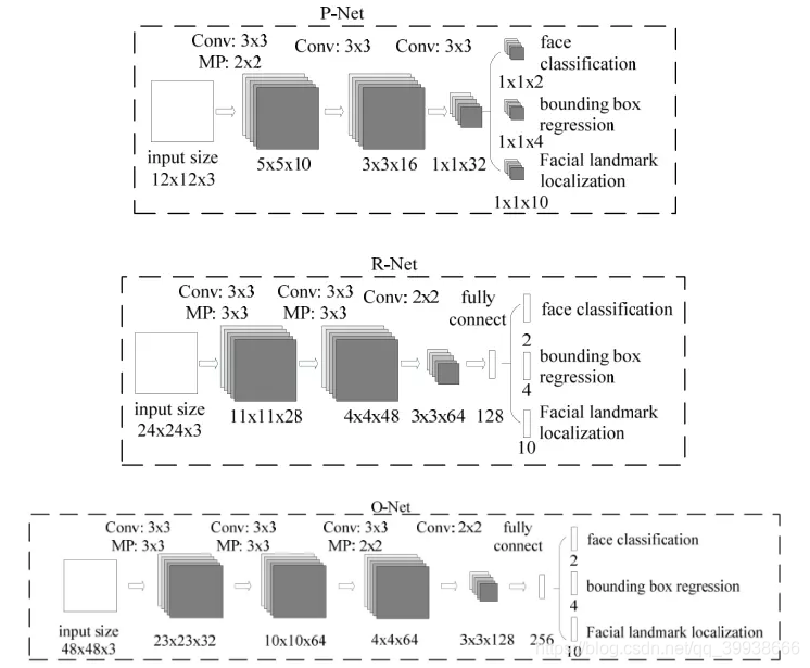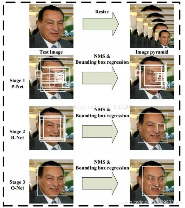 样本预处理(数据集用celeba,拿来先生成3种尺寸12*12/24*24/48*48,每种尺寸含正、负、部分3类) ——> 写P、R、O网络——> 训练网络,得到pkl权重文件 ——> 测试。