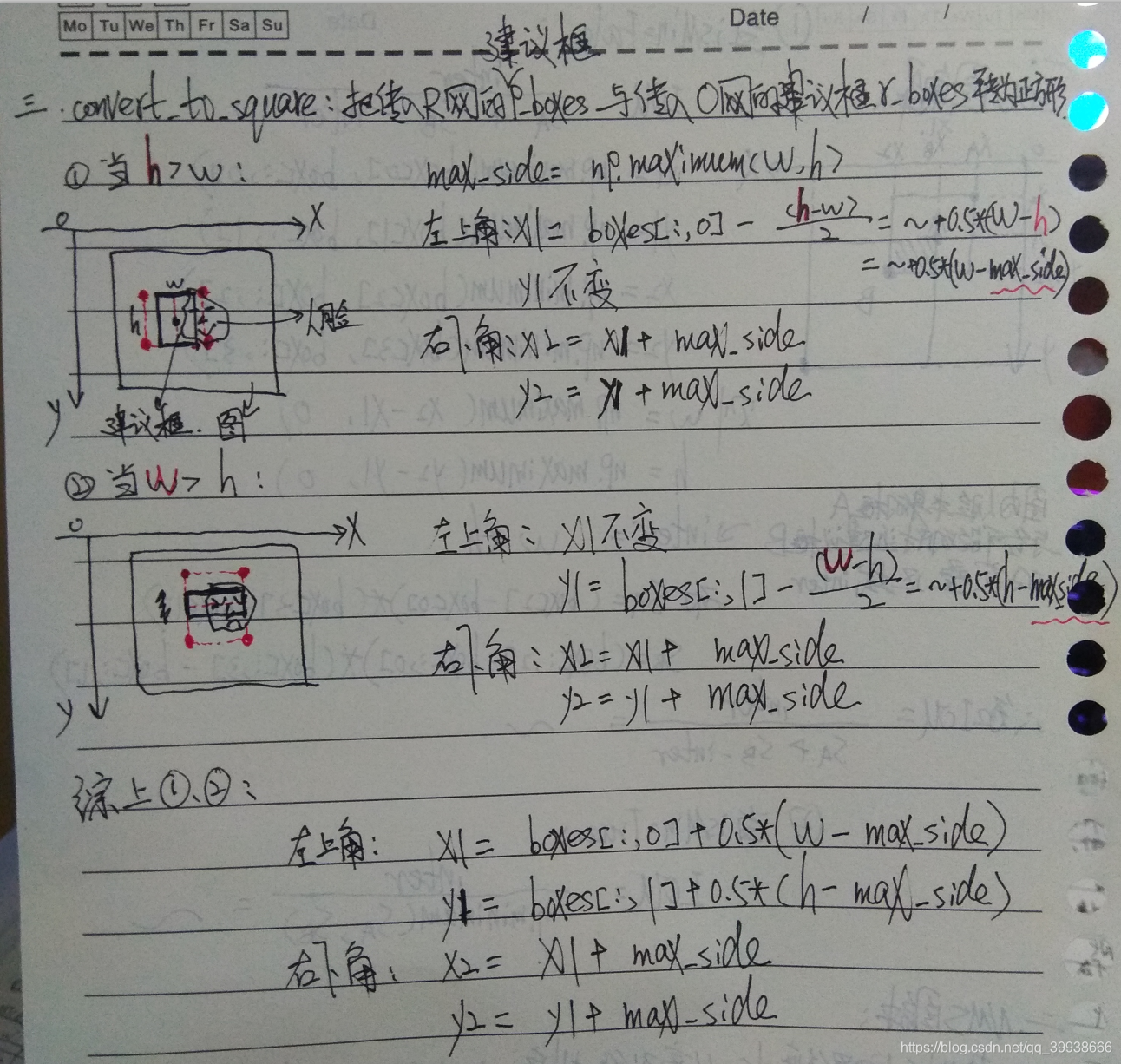 把P得到的这些boxes先补成正方形_pnet_boxes = utils.convert_to_square(pnet_boxes),之后按坐标在原图上把可能是人脸的区域剪下来,再resize到24*24 ——> 经cls, offset = self.rnet(imgdataset)得置信度与偏移量,取置信度大于阈值0.6的。由偏移量求得原建议框坐标集合r_boxes